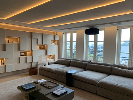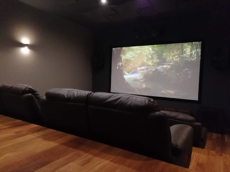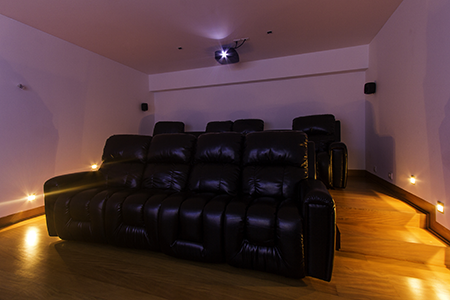 También tenemos espacios en donde la familia es pequeña y son cinéfilos. Este tipo de cliente generalmente quieren un espacio dedicado para ver películas y series sin parar. Si tienen el espacio para un cine les ofrecemos butacas automatizadas e independientes o hacemos a medida sófas con determinada cantidad de cuerpos automatizados. Estás reclinan por completo su respaldar, el asiento y el apoya pies. Además podemos incluir todo tipo de accesorios para mayor comodidad como calentador o enfriador de asiento, luces, cargador de teléfono, etc.