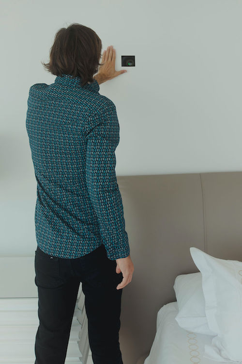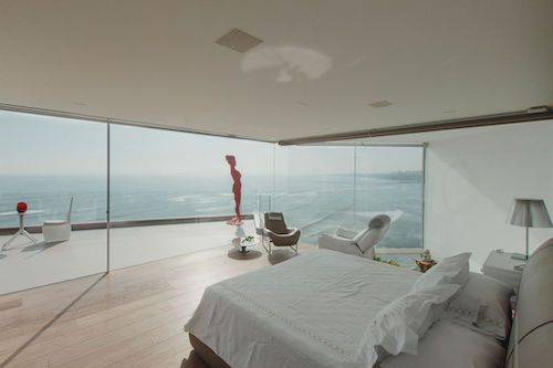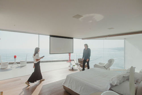 Tomamos el reto con mucha ilusión y luego de varias reuniones con nuestro equipo de diseño, volvimos con una propuesta en donde ningún equipo quedaba a la vista: La pantalla retráctil se embutiría en el dintel que queda entre la mampara y el falso cielo raso. Y el proyector se esconde en el walking closet que viene a ser la habitación contigua pegada a la cabecera de la cama y solo se deja un calado de 10 cm en la pared para dejar expuesto el lente del proyector. Todo esto no es tan sencillo como se cree, se estudian los equipos, el nivel de ventilación requerido y el calentamiento de estos, para tomar en cuenta todas las consideraciones posibles.