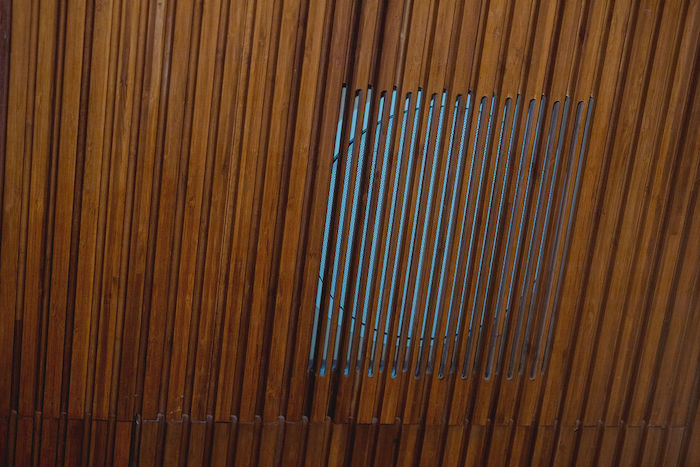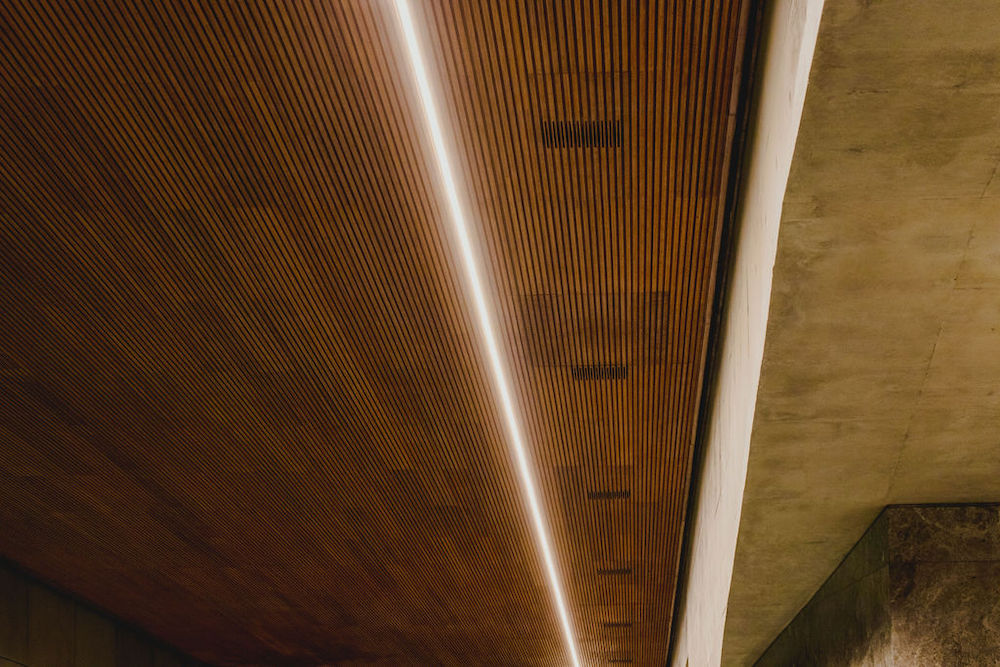 ¿Que hicimos? Calculamos el volumen del espacio para colocar la cantidad adecuada de parlantes. En este caso fueron 10. Estos los pusimos junto a material acústico empotrados en el techo pero sobre estos diseñamos en conjunto con la carpintería de la obra tapas apaleadas con abertura que le daban continuidad al techo de madera pero que a su vez dejaban pasar el sonido.